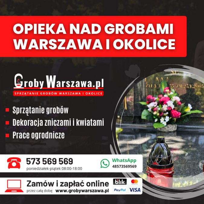Sprzątanie grobów Ząbki. Opieka nad grobami Warszawa i okolice: - sprzątanie grobu i terenu wokół, - dekoracja zniczami i kwiatami, - prace ogrodnicze. Zadzwoń do nas, aby ustalić szczegóły dotyczące opieki nad grobem - tel. 573 569 569 (pn-pt 8-18) / WhatsApp Sprzątanie grobu możesz zamówić i opłacić online (BLIK, karta, PayPal, przelew) - www.grobywarszawa.pl Nasze usługi obejmują wszystkie cmentarze w Warszawie, m.in.: – Cmentarz Bródnowski Warszawa – Cmentarz Komunalny Północny Warszawa – Cmentarz Stare Powązki Warszawa – Cmentarz Powązki Wojskowe Warszawa – Cmentarz Wawrzyszewski Warszawa – Cmentarz Wolski Warszawa – Cmentarz Komunalny Południowy Antoninów i inne. Sprzątanie grobów wykonujemy również na cmentarzach w promieniu ok. 30 km od stolicy.