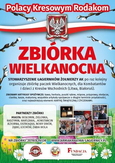 W związku z nadchodzącym świętami Wielkanocnymi zwracamy się z apelem do ludzi dobrej woli o dar serca w postaci paczek świątecznych z żywnością, które będą zbierane w ramach corocznej akcji POLACY KRESOWYM RODAKOM. Społeczna akcja organizowana przez Stowarzyszenie Łagierników Żołnierzy AK . Akcja zbiórki społecznej POLACY – KRESOWYM STRACEŃCOM, jest skierowana do polskich dzieci z bardzo ubogich rodzin oraz dzieci domu dziecka zamieszkujących na terenie Grodzieńszczyzny i Wileńszczyzny oraz Ukrainy a także głównie do ostatnich żyjących na terenie Białorusi, Litwy, Ukrainy żołnierzy Armii Krajowej (i ich najbliższych). Adresatami są potrzebujący kombatanci z szeregów AK z których większość za walkę o Niepodległość Polski młodzieńcze lata spędziła w niewoli okupanta sowieckiego, w okrutnych warunkach łagrów syberyjskich