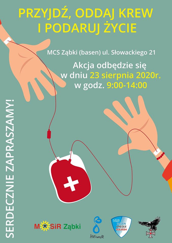 Zapraszamy na kolejną ząbkowską zbiórkę krwi z cyklu PRZYJDŹ, ODDAJ KREW i PODARUJ ŻYCIE, która odbędzie się w dniu 23 sierpnia 2020 r. w godzinach 9:00-14:00 na parkingu przed pływalnią miejską w Ząbkach, przy ul. Słowackiego 21.