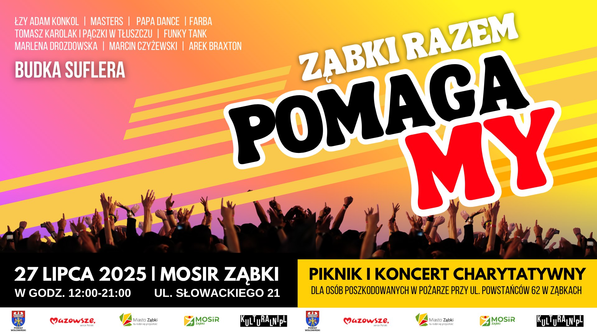 27 lipca gramy dla poszkodowanych w pożarze przy ul. Powstańców 62 w Ząbkach! Na terenie Miejskiego Ośrodka Sportu i Rekreacji odbędzie się PIKNIK I KONCERT CHARYTATYWNY - Ząbki Razem PomagaMy! Partnerem Pikniku i Koncertu Charytatywnego - Ząbki Razem - Pomagamy! jest Samorząd Województwa Mazowieckiego. | ![]() |